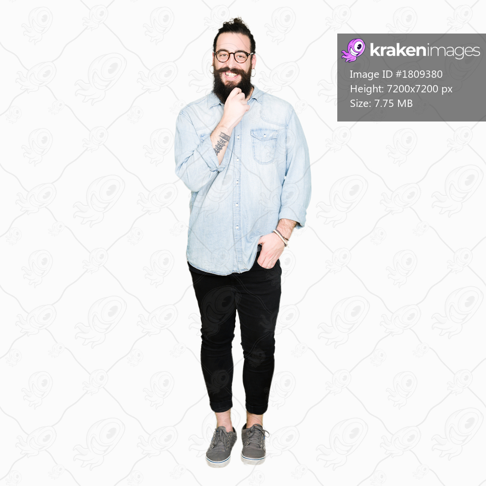 Young hipster man with long hair and beard wearing glasses looking confident at the camera with smile with crossed arms and hand raised on chin. Thinking positive. - Kraken Images