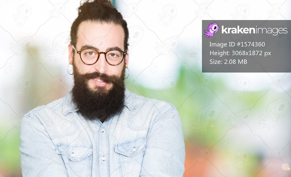 Young hipster man with long hair and beard wearing glasses Smiling with hands palms together receiving or giving gesture. Hold and protection