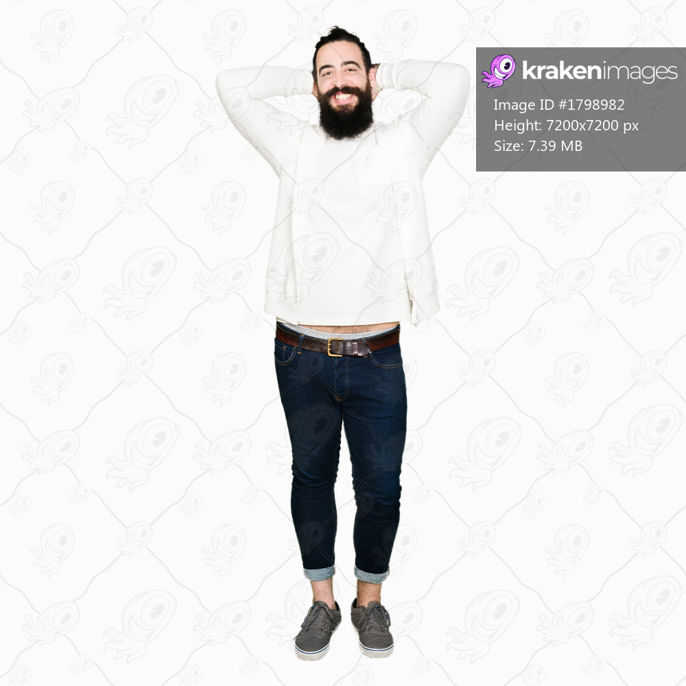 Young hipster man with long hair and beard wearing sporty sweatshirt Relaxing and stretching with arms and hands behind head and neck, smiling happy