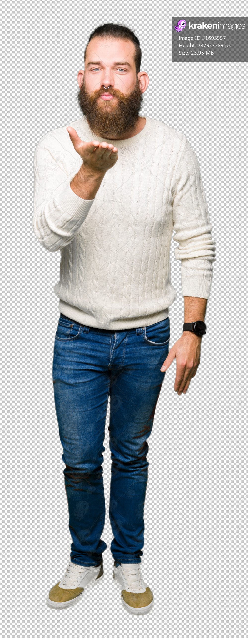 Young hipster man wearing winter sweater looking at the camera blowing a kiss with hand on air being lovely and sexy. Love expression.