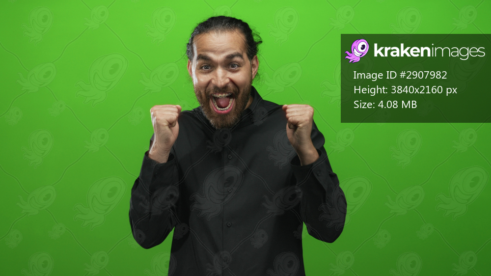 Young hispanic arab man with clenched fists shouting and cheering in green studio; excitement celebration joy.