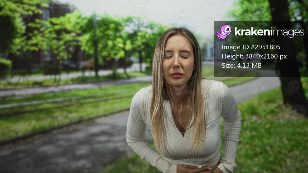 Young hispanic blonde woman with bare midriff and hands on stomach on a street in a green park; discomfort introspection.