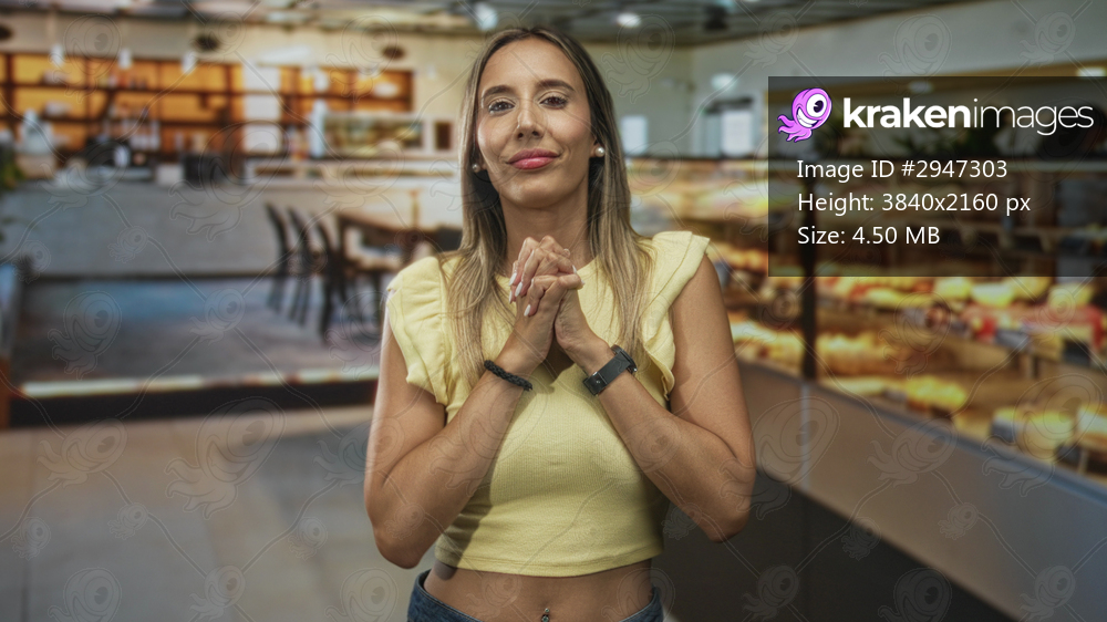 Young hispanic blonde woman with clasped hands and a gentle smile at bakery counter in building beside pastry display case; serenity gratitude.
