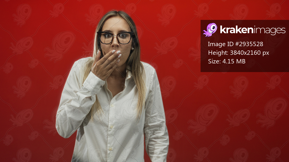Young hispanic blonde woman covering mouth with hand and wide eyes in red studio wearing glasses and white shirt; surprise disbelief.