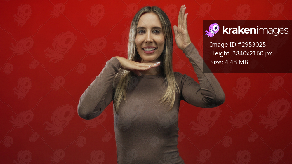 Young hispanic blonde woman framing her face with hands and smiling in a red studio setting; playful joy.