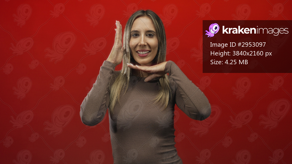 Young hispanic blonde woman framing her face with hands and smiling in a red studio setting; playful joy.