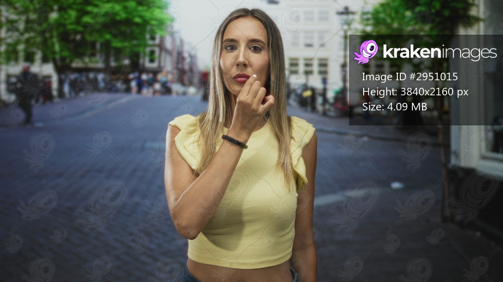 Young hispanic blonde woman, hand at mouth and finger to lips for silence, posed on a cobblestone street in the city; silence introspection.