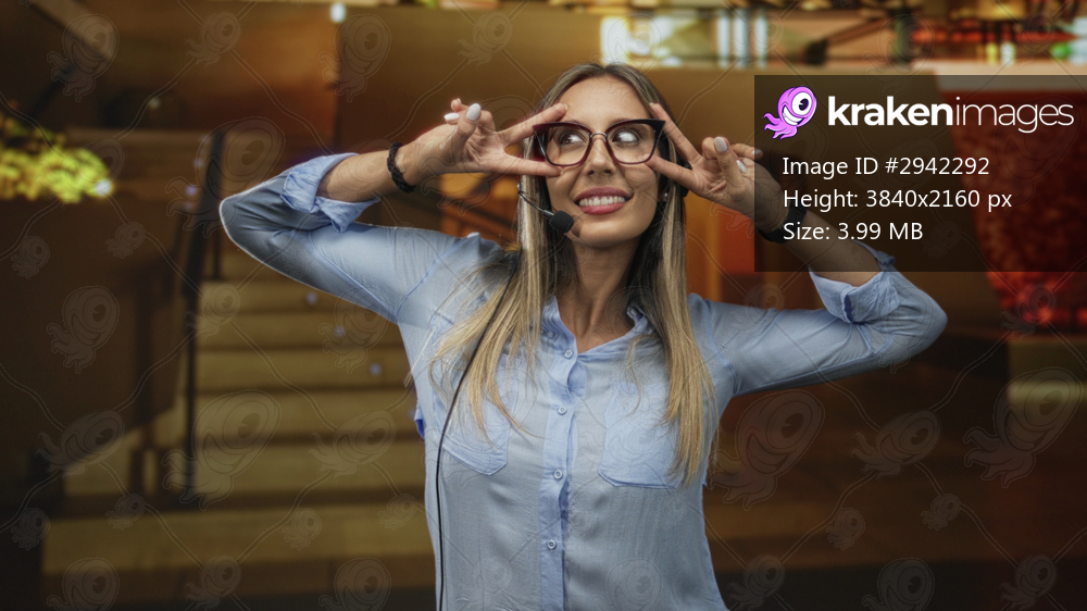 Young hispanic blonde woman with headset and glasses flashes peace sign fingers to eyes in hotel building lobby while smiling; playful optimism.