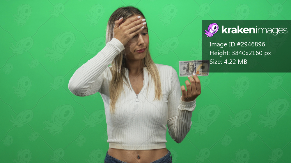 Young hispanic blonde woman holding a us banknote and hand to forehead in green studio; financial worry.