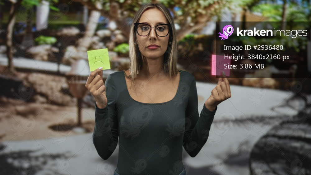 Young hispanic blonde woman holding green frown and pink smile sticky notes with both hands while looking at them, wearing glasses in street scene; inner indecision. - Kraken Images