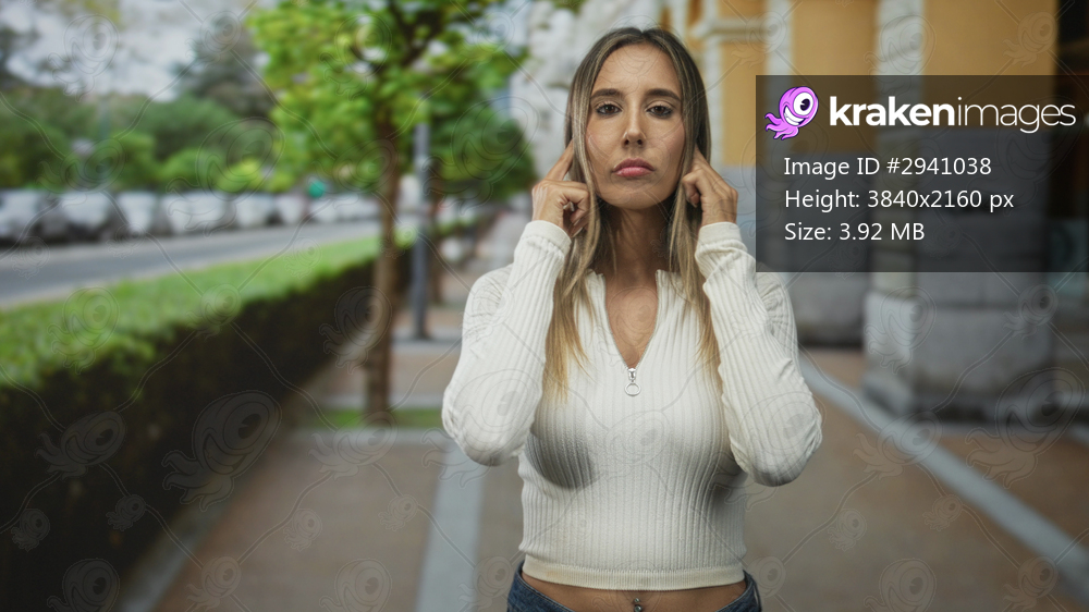 Young hispanic blonde woman holding hands to ears on city street by stone building and trimmed hedge, wearing white ribbed sweater and jeans; stress.