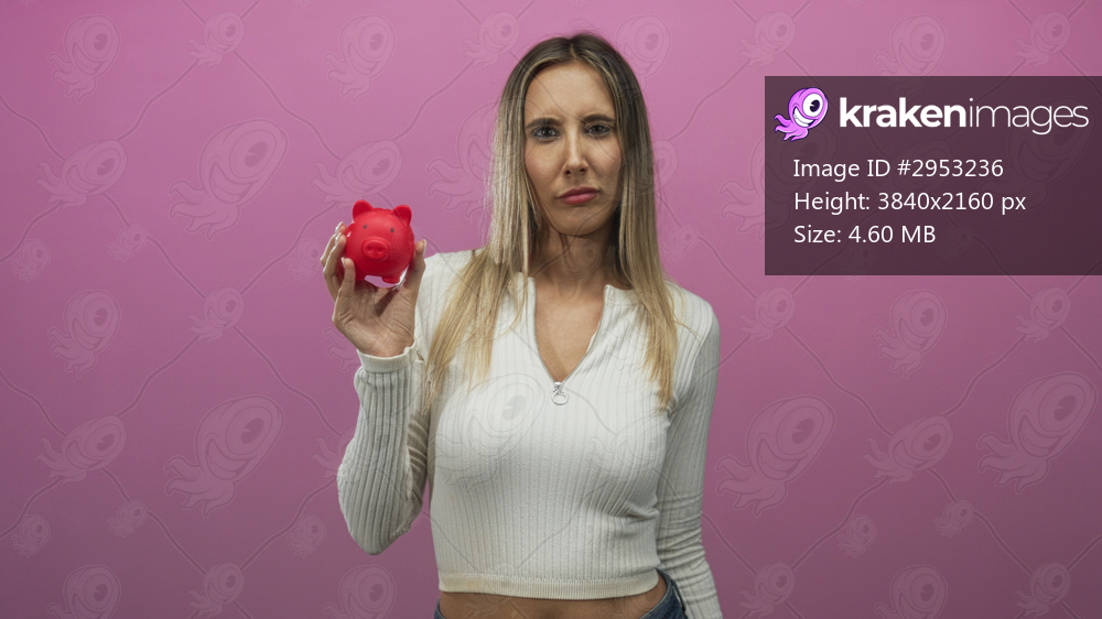Young hispanic blonde woman holding red piggy bank in pink studio with hand raised to show savings; money concern.