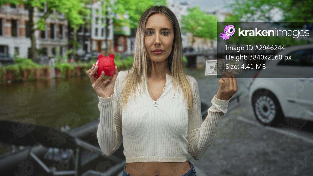 Young hispanic blonde woman holding red piggybank and hundred dollar bill at amsterdam canal; savings planning decision calm.