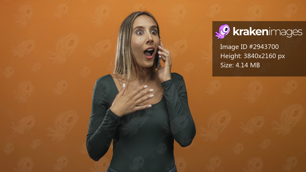 Young hispanic blonde woman holding smartphone to ear with hand on chest in orange studio; surprise reaction.