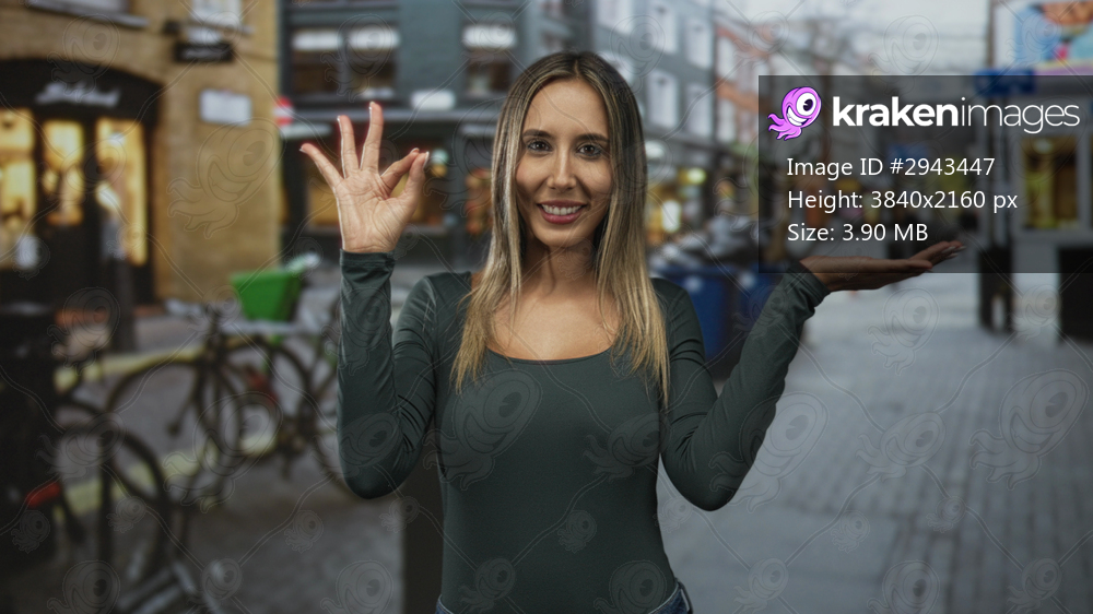 Young hispanic blonde woman making ok sign with right hand and open palm presenting on street in city; joyful playful.
