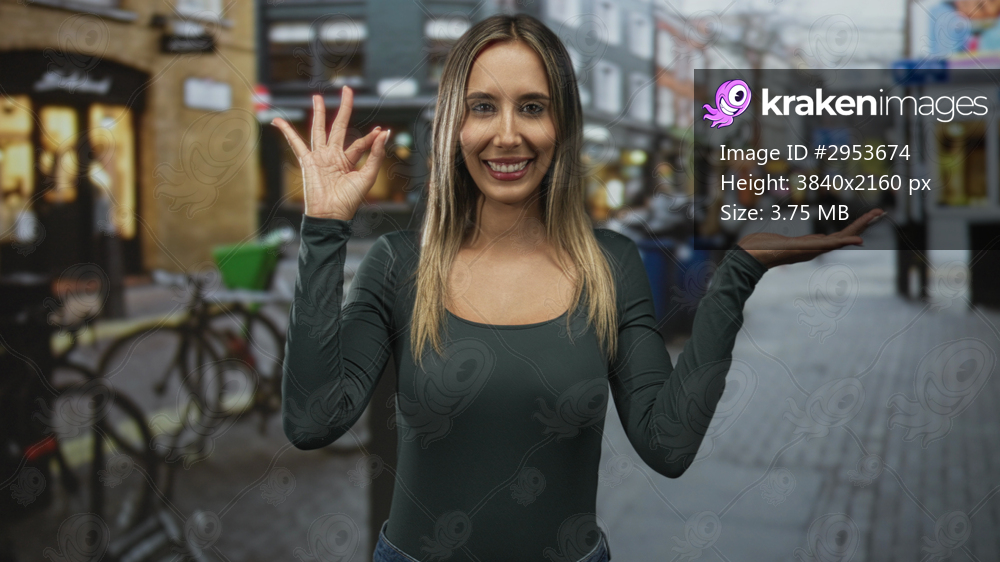 Young hispanic blonde woman making ok sign with right hand and open palm presenting on street in city; joyful playful.