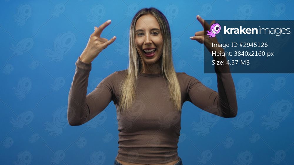 Young hispanic blonde woman making rock horns gesture with both hands and smiling in blue studio; playful confidence.