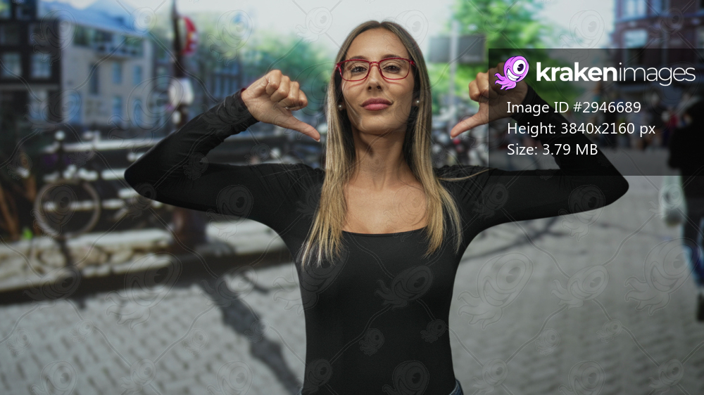 Young hispanic blonde woman pointing thumbs at chest on city street wearing red glasses and black top; self confidence.