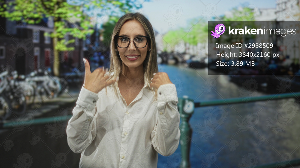 Young hispanic blonde woman points with both hands on street bridge by canal in amsterdam while smiling; friendly invitation.