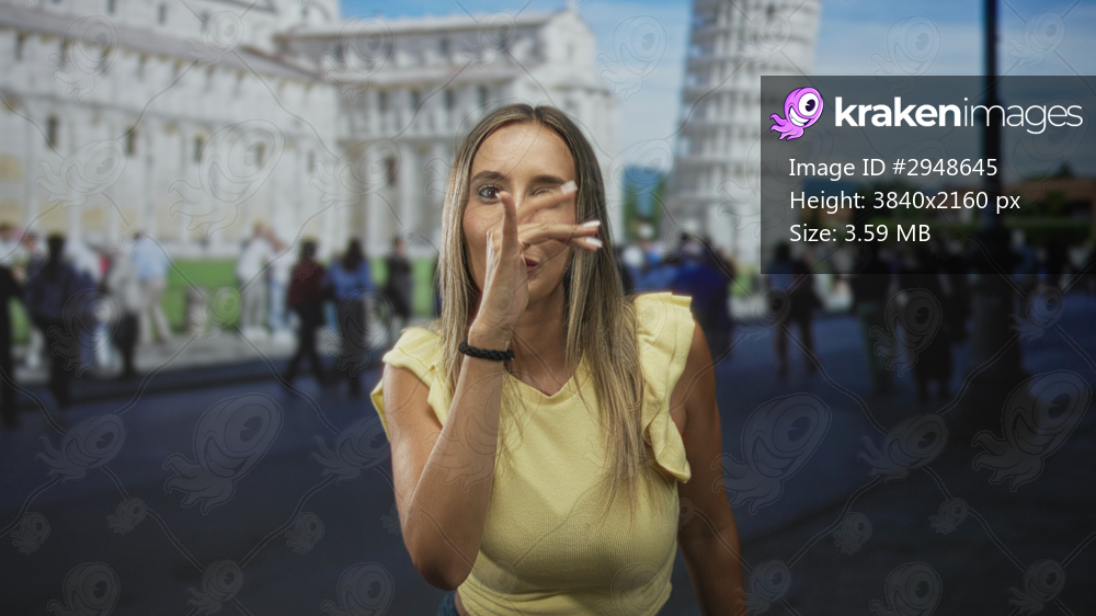 Young hispanic blonde woman showing navel and pointing finger at camera in building piazza with tourists in view; travel confidence.