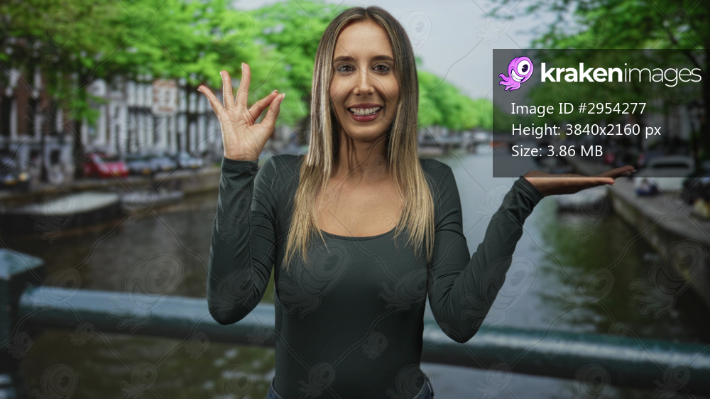 Young hispanic blonde woman showing ok sign with right hand and palm up left hand on amsterdam canal bridge outdoors, smiling with closed eyes; joy travel leisure. - Kraken Images