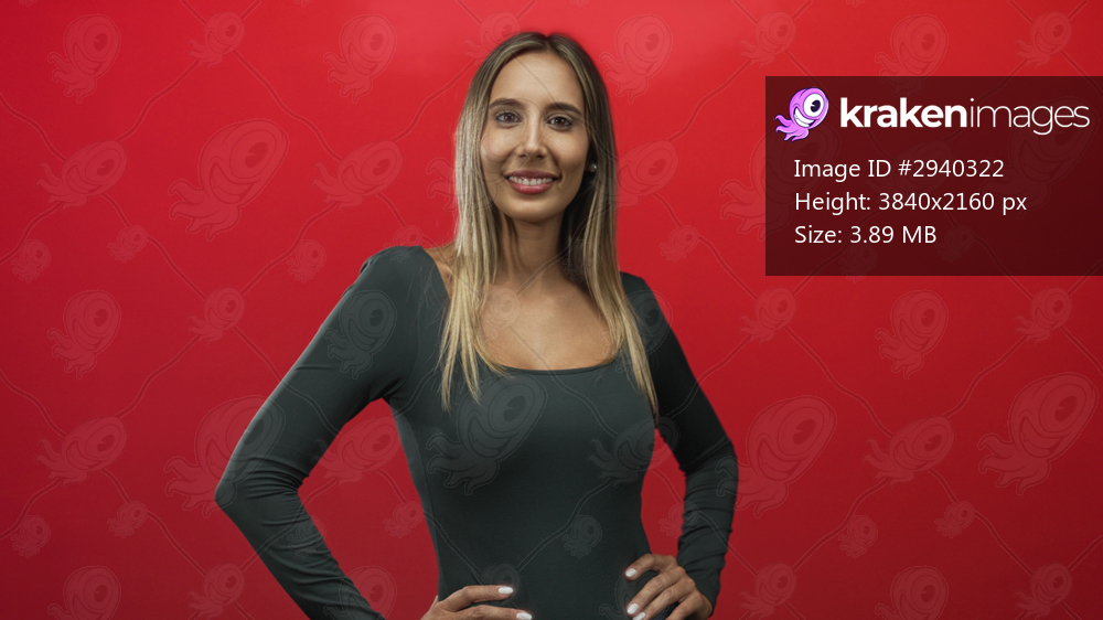 Young hispanic blonde woman smiling with hands on hips and visible shoulders against red studio wall; confidence empowerment.