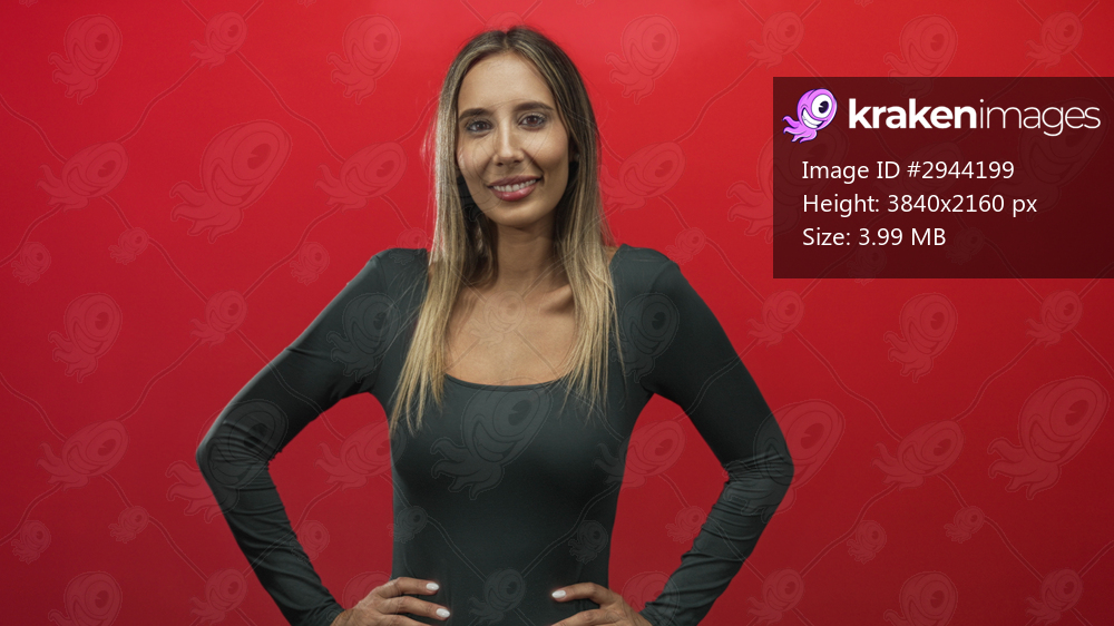 Young hispanic blonde woman smiling with hands on hips and visible shoulders against red studio wall; confidence empowerment.