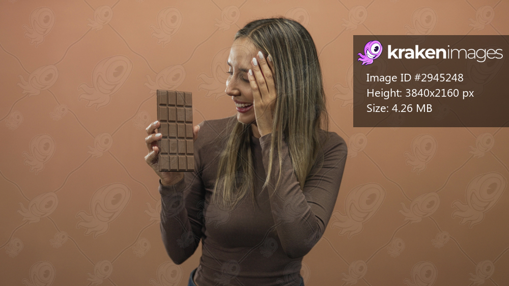 Young hispanic blonde woman smiling while holding a large chocolate bar and covering one eye with her hand in a peach studio; playful indulgence.