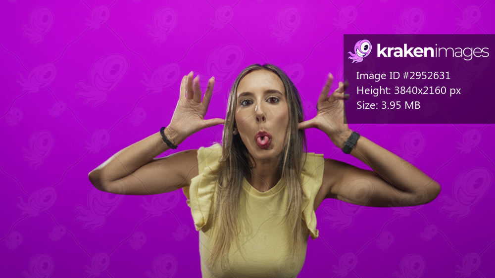 Young hispanic blonde woman sticks tongue out and shows bellybutton against a magenta studio backdrop; playful candid moment.