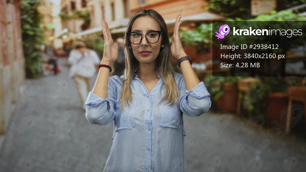 Young hispanic blonde woman wearing glasses and a blue shirt, hands framing face while smiling in a cobbled street with cafe planters; confidence self expression. - Kraken Images