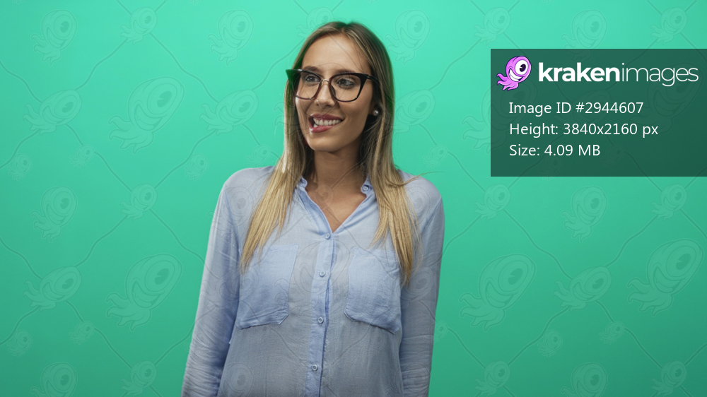 Young hispanic blonde woman wearing glasses smiling and turning head in mint green studio; playful confidence.