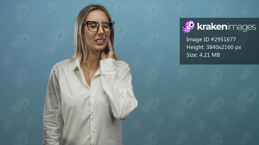 Young hispanic blonde woman wearing glasses and white shirt holding hand on cheek in studio against blue backdrop; toothache pain.