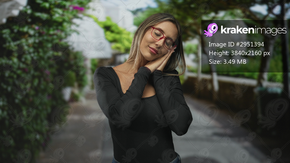 Young hispanic blonde woman wearing red glasses, hands to cheek for sleep gesture on a tree lined street walkway near buildings and planters; calm rest. - Kraken Images