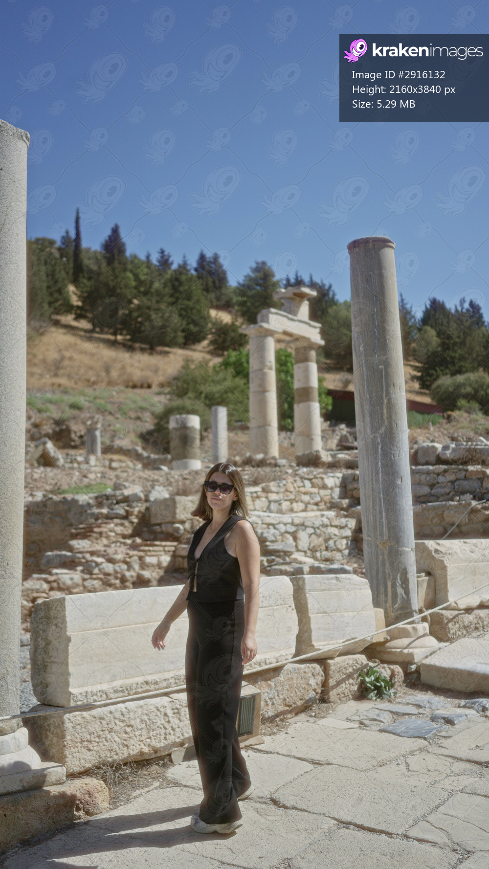 Young hispanic brunette woman adjusts sunglasses while standing among ancient marble columns and walking on stone path at building ruins in ephesus turkey; serenity. - Kraken Images