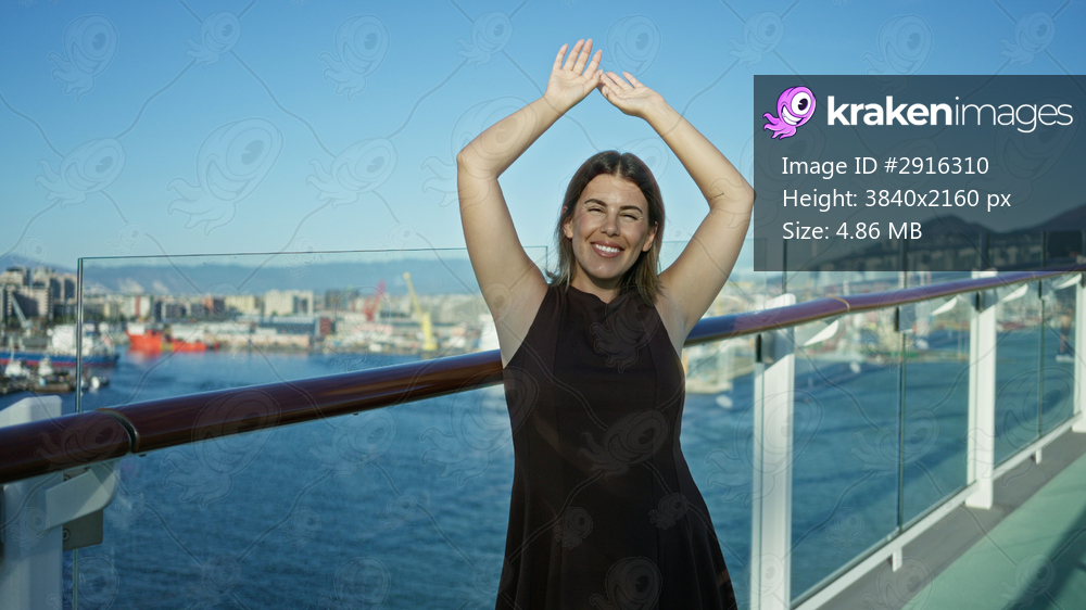 Young hispanic brunette woman with arms outstretched on cruise ship deck railing smiling in sunlight under clear blue sky; joy freedom.