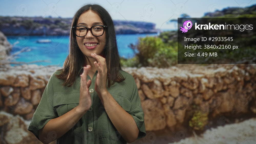 Young hispanic brunette woman clapping hands on a stone seaside promenade by turquoise water wearing green shirt and glasses; joy.