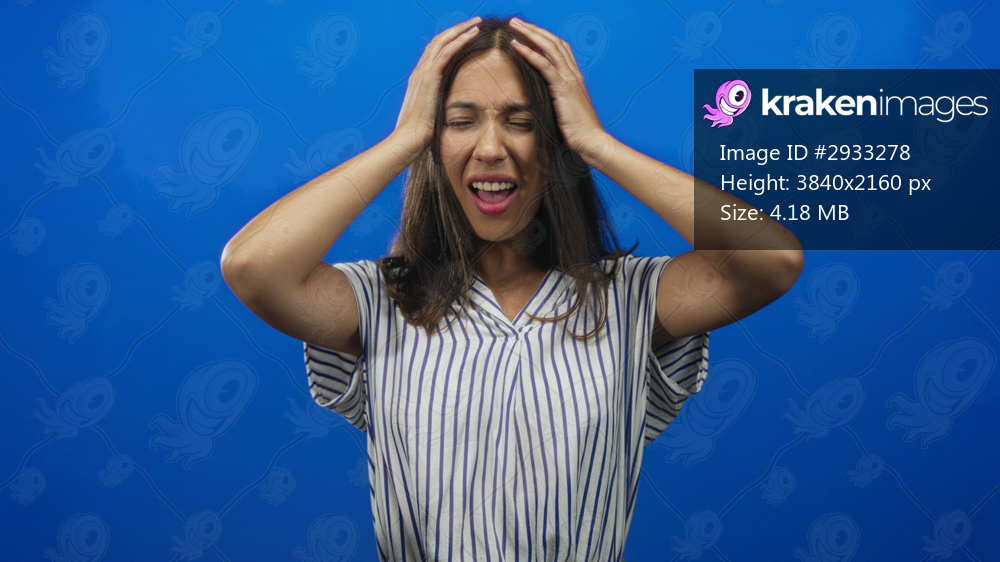 Young hispanic brunette woman clutching head with both hands, eyes closed and grimacing, wearing striped shirt in blue studio; stress.