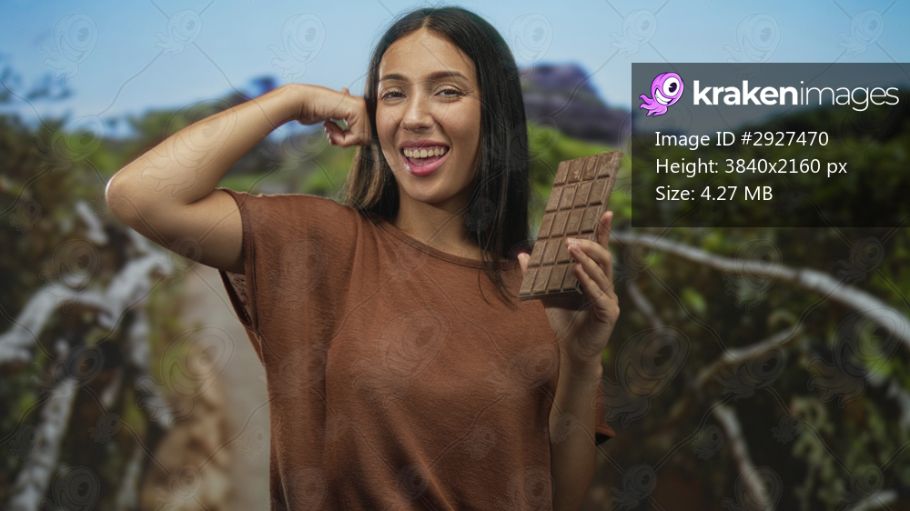 Young hispanic brunette woman flexes arm while holding chocolate bar in forest with green foliage and trail visible; confidence indulgence.