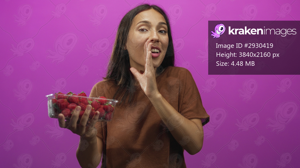 Young hispanic brunette woman holding a plastic container of strawberries and hand to mouth whisper gesture in studio with magenta backdrop; playful delight. - Kraken Images