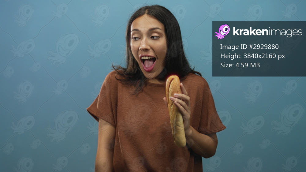 Young hispanic brunette woman holding baguette and smiling in studio with blue wall; surprise craving indulgence.