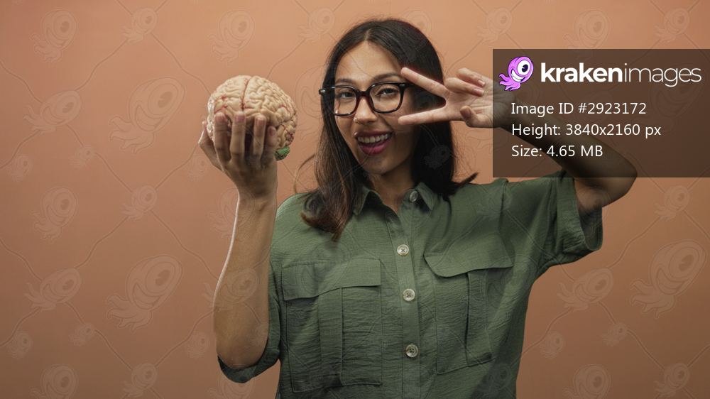 Young hispanic brunette woman holding brain model in hand and making a peace sign by her eye in a peach studio; playful curiosity.