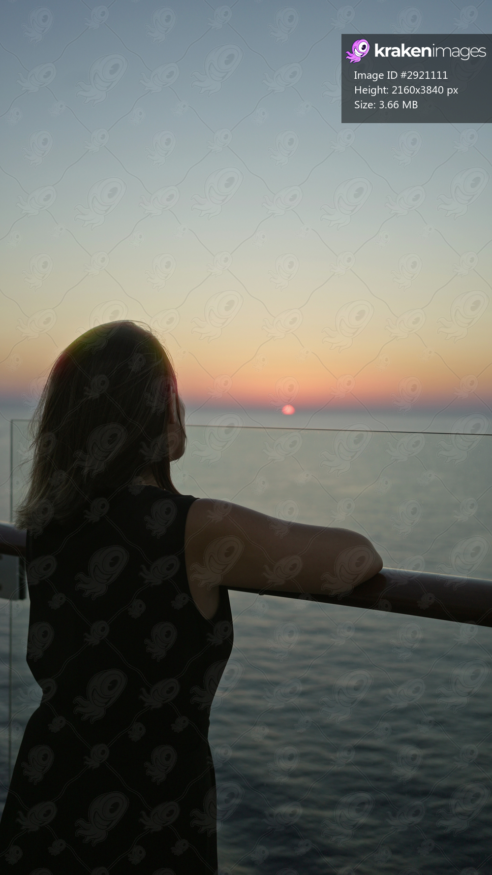 Young hispanic brunette woman leaning on cruise deck rail, bare arm resting on railing, watching sunset over ocean; serenity.