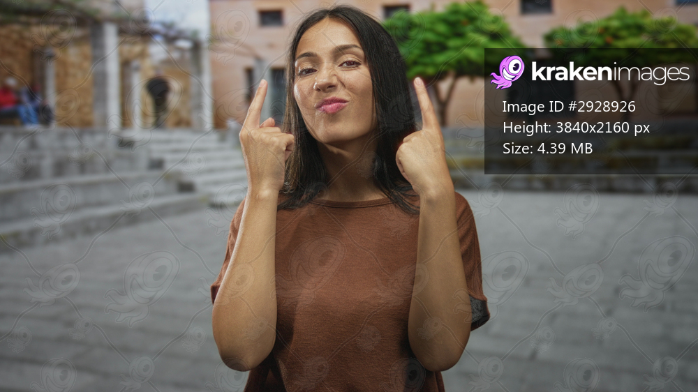 Young hispanic brunette woman pointing both index fingers upward on a cobblestone street near stone steps and trees; hopeful.