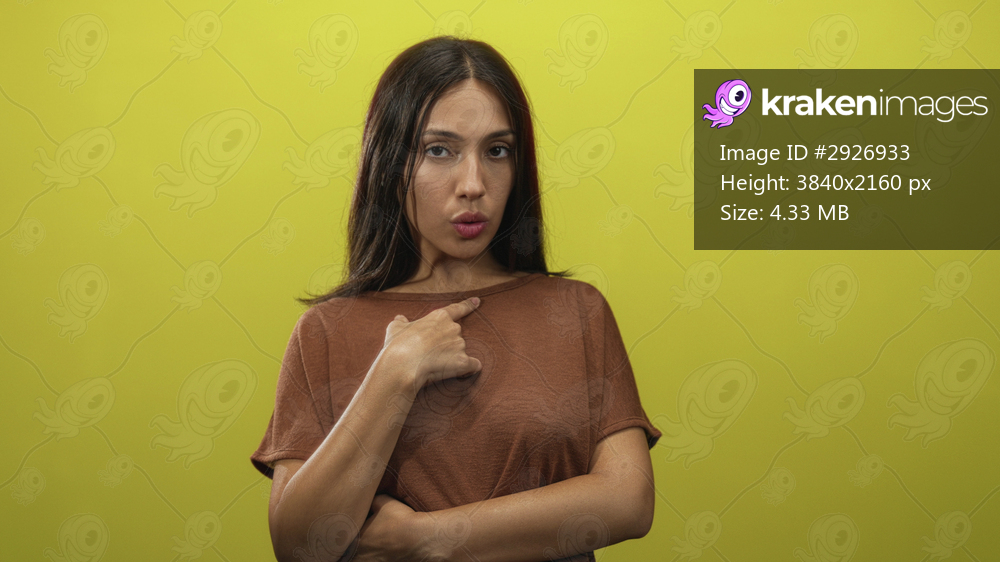 Young hispanic brunette woman points finger in yellow studio, crossed arms and pursed lips expressing dismissive gesture; confidence sass.