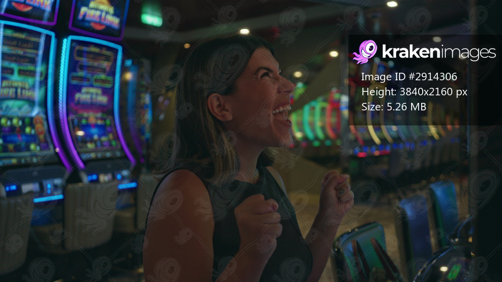 Young hispanic brunette woman shouting and cheering with clenched fists at a slot machine row inside a building with neon lights; winning joy.