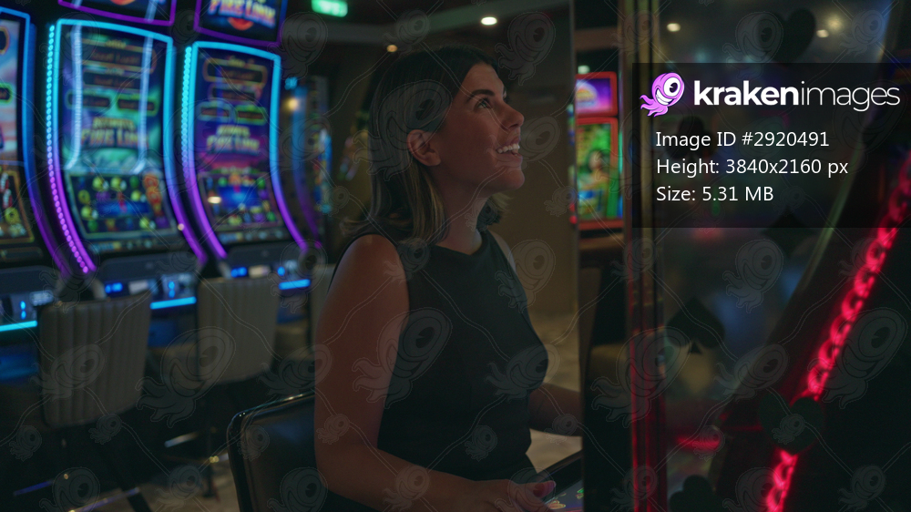 Young hispanic brunette woman shouting and cheering with clenched fists at a slot machine row inside a building with neon lights; winning joy.