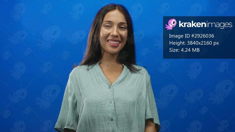 Young hispanic brunette woman showing teeth and smiling in blue studio wearing mint shirt; happiness confidence.