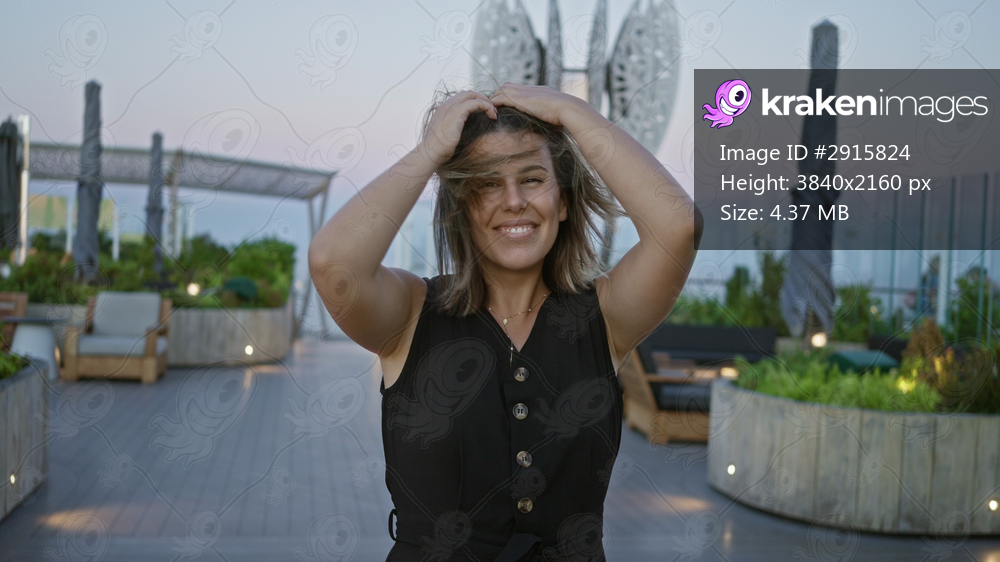 Young hispanic brunette woman smiling and running hands through hair on building terrace of cruise ship deck with planters and lounge chairs; joy relaxation. - Kraken Images