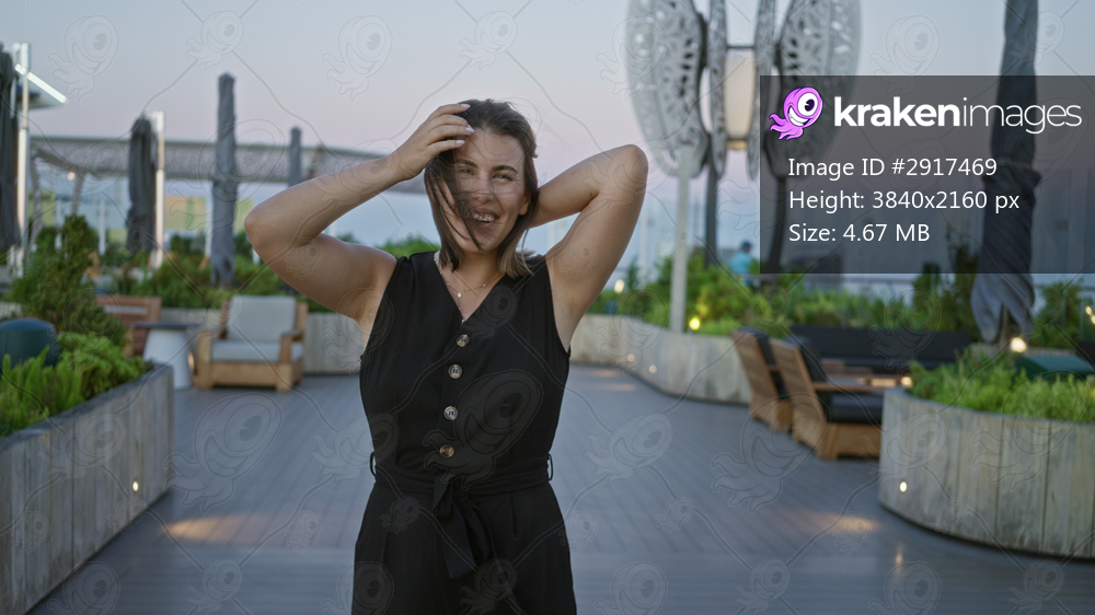 Young hispanic brunette woman smiling and running hands through hair on building terrace of cruise ship deck with planters and lounge chairs; joy relaxation. - Kraken Images