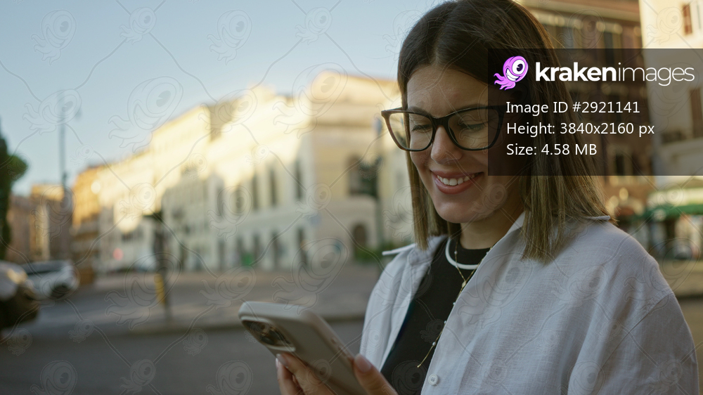Young hispanic brunette woman tapping phone screen with both hands on a rome street near historic building, smiling while checking messages; everyday connection contentment. - Kraken Images